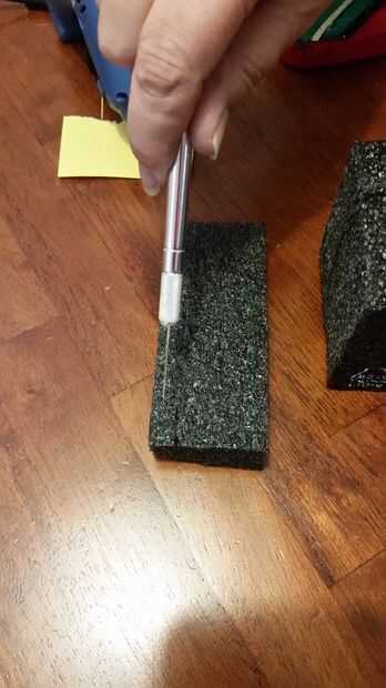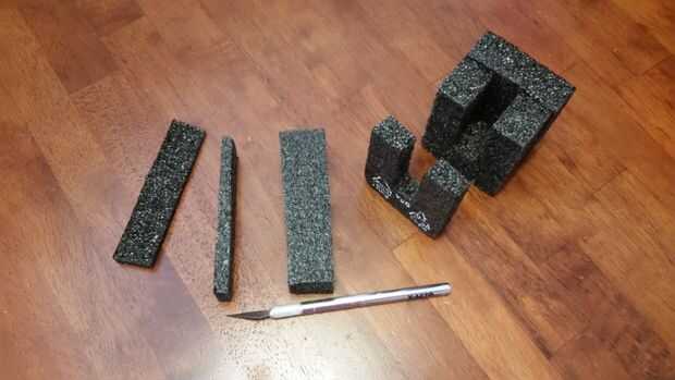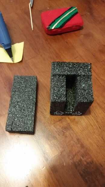 En este paso, si tienes espuma de embalaje electrónico que tiene la U, usted puede simplemente cortar una pulgada 1/2 rebanada de la U para las piernas. Si va a crear las patas de un bloque de espuma de poliestireno, cortar dos piezas de 3 x 1/2 x 1/2 pulgada.