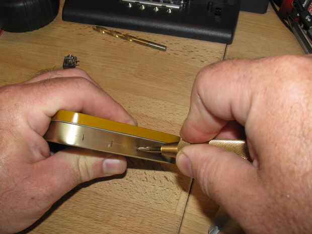 Sugerencia: es una buena idea de poner un trozo pequeño de madera o un borrador de goma grande detrás del metal fino para evitar la flexión.