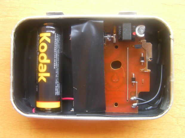 El otro cable del condensador se inclinó sobre el borde de la lata de 1/4 de pulgada. La cinta en el borde de la lata se asegurará que este cable no viene realmente en contacto con la poder sí mismo. El propósito de este cable es entrar en contacto con la tapa cuando se coloca en la lata (así ' electrizante' la tapa). Tenga en cuenta que la placa de circuito está siempre 'viva' cuando la batería esté en su sitio (usted consigue cerca de 4 horas de sorprendente diversión de una pila AA estándar).