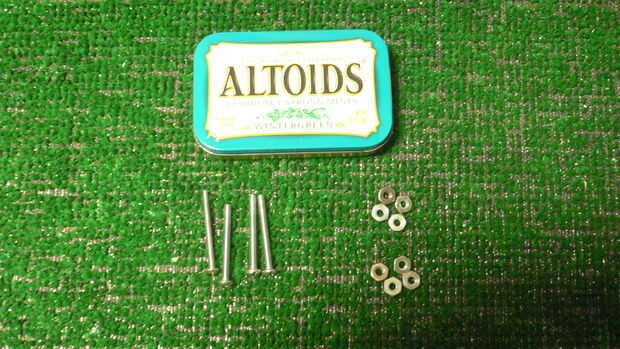 Get your parts together. 1. Altoid puede 2. largo de 5 tornillos con dos tuercas de cada tornillo. 3 destornillador de cabeza plana 4. broca broca un poco más grande que se Pintura resistente al calor opcional 5 para los hoyos de la barbacoa.