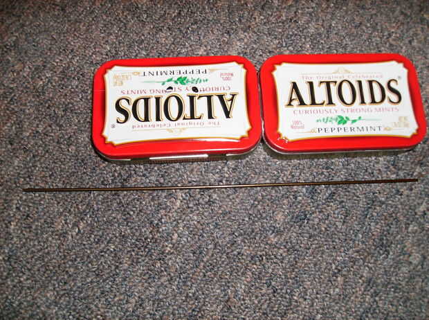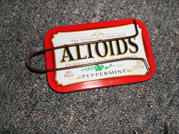 a. tomar el gancho de alambre y cortar un pedazo recto de él un poco más de dos veces tanto como la lata Altoids.