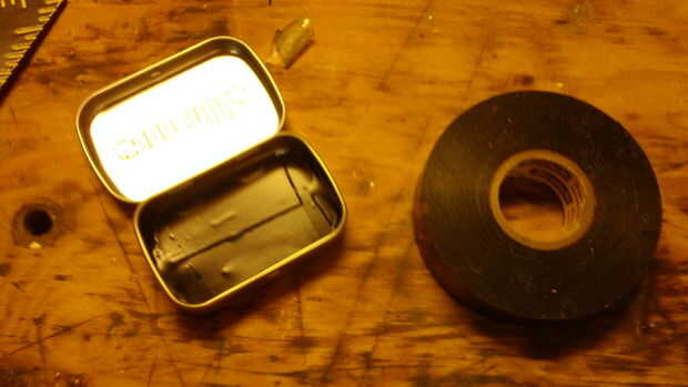 Después de lavarla, cubrir el fondo de la lata Altoids en cinta aislante. Puede pasar como corto o lo largo de un tiempo en esto dependiendo de tu nivel de TOC, pero lo importante es que ninguna de las partes conductoras del circuito de contacto con la lata. Mientras que generalmente las latas son inicialmente cubiertas con un material aislante, aislante es fácilmente frotando o dañado.