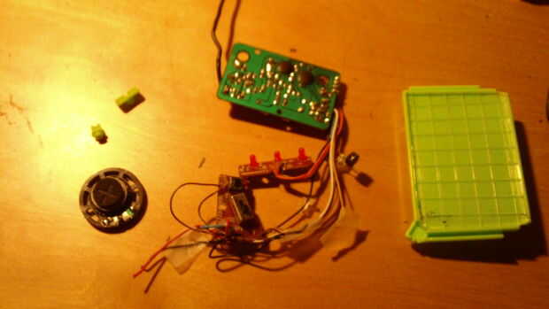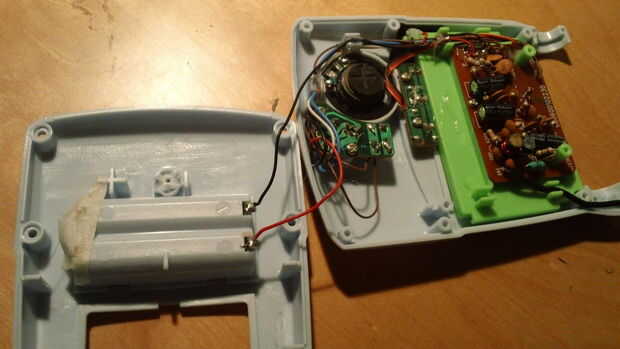 Corte los cables conectados a los bornes de la batería para separar las dos mitades. Desenroscar los circuitos de la mitad restante. Nuestro objetivo aquí es todo separar completamente de la cáscara medio. En mi caso, terminé tener que desprenda cuidadosamente pegamento caliente que sostenía el cableado al plástico. También, conseguir el altavoz hacia fuera con un destornillador de cabeza plana a través de la grieta al lado de la orilla y aprovechando que. Yo de desoldar y quitar primero el resto del circuito.