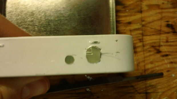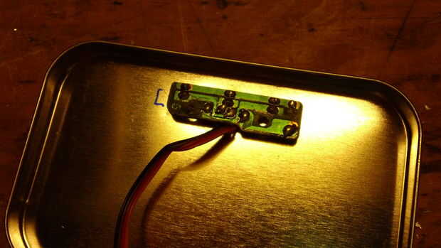 Sin embargo, llegué a un problema, y que los cables de conexión junta al resto de la hacia fuera de dispositivo también, lo que significa que tendría que encontrar la manera de llegar los cables alrededor de la parte posterior. Pensé acerca de desoldadura todos los cables, pero entonces decidido que hacer un agujero en la parte inferior de la Junta (donde no había ningún rastro eléctrico) que pude pegar los cables a través era más fácil. Ver la primera foto.