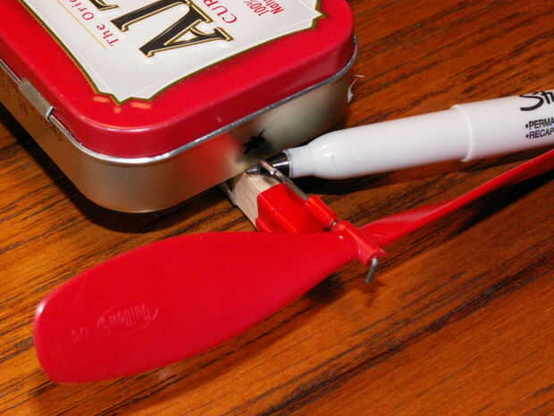Sostenga la lata Altoids en el cuerpo del avión y marca la lata en el centro del gancho motor.