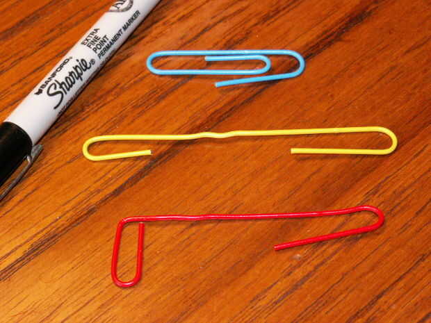 Necesita 4 clips de papel grandes de alambre como el clip azul en la imagen.