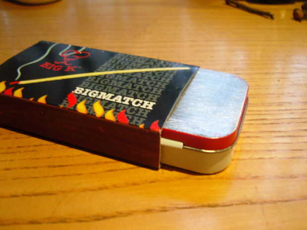 Debajo es una imagen de ejemplo de cómo puede embalarlo, no tengo un encendedor así incluí algunos fósforos, también encontré que la lata colocada dentro de la caja de cerillas: P