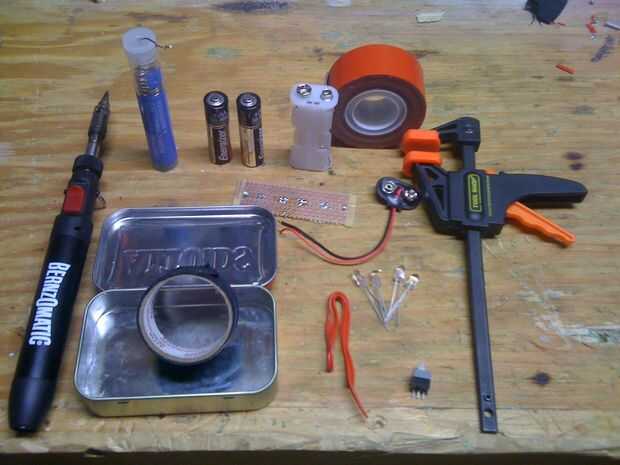 Aquí están los siguientes suministros que usted necesitará: Altoids puede, pistola, cuatro luces de 5 m m led (cualquier color), soldadura, abrazadera de la batería de la soldadura, doble cinta adhesiva echada a un lado, cosita de portapilas AA, 2 pilas AA, un pequeño empuje el interruptor (tengo la mía de un viejo botón de encendido de equipos, aburre un poco circuito y algún tipo de abrazadera para sostener algo firmemente juntos, oh y algunos cables