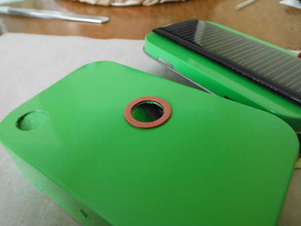 Una vez que hayas decidido en dónde estás poniendo lo, perforar un agujero para la base de la dinamo y otra para el eje de la manivela, por lo que puede ser doblado en la lata cuando no estés usando. Solía un guardapolvo RCA en el interior de la lata para el huso de mano doble en sólo para asegurarse de que agua, la suciedad y el polvo no entrar en la lata y dañar las baterías y otros componentes electrónicos.