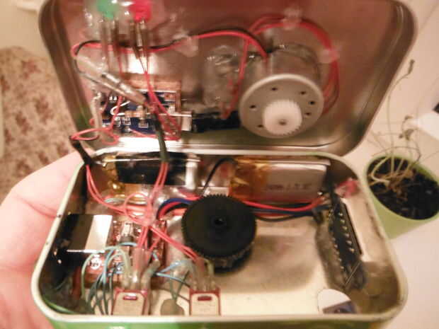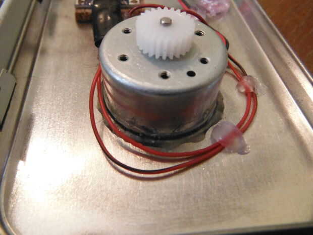 A continuación, usted necesita encontrar un buen lugar para ella en la lata. Esto realmente debe ser decidido en la fase de planificación porque probablemente será la parte más grande dentro de la bandeja y que necesitará a la base donde todo lo demás va en donde colocar la dinamo. Decidí poner minas en la parte inferior de la lata cerca del centro. Que permite la manivela que se doblará en la lata fácilmente.