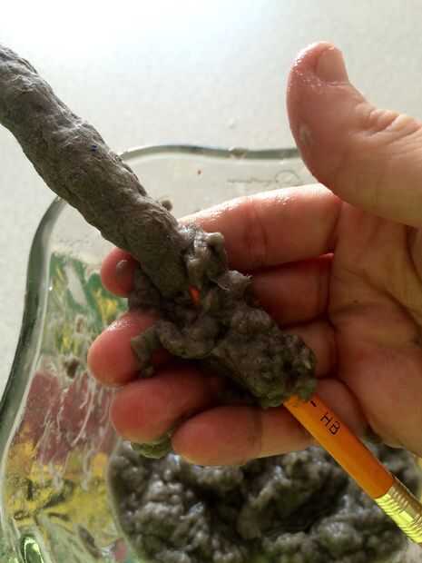Envolver el cartón de huevo húmedo alrededor de la pluma o lápiz y exprimir tanta agua como sea posible.