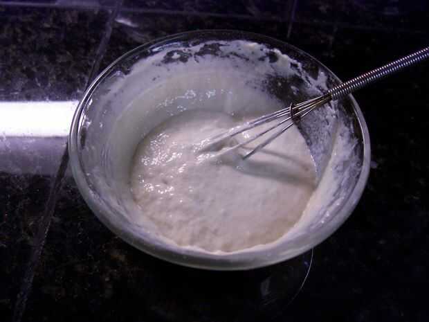 Combinar la harina y un toque de aceite en el recipiente, dejar caer una pizca de sal al gusto si desea. Agua de lluvia en que removemos la mezcla. Desea que la consistencia sea más seco que húmedo, pero no polvo. (Ver fotos 2 y 3)