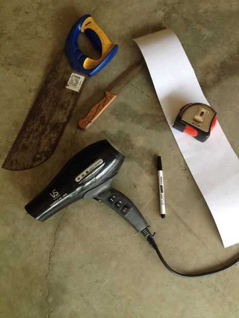 Cuchillo de sierra, pistola de calor secador de pelo, pluma, cinta métrica, cierta madera de cortes,