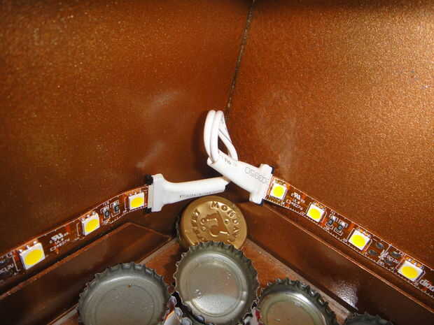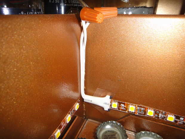 Tomar la luz de la cinta y coloque todos los conectores antes de tiempo. Una vez que todos los conectores se acoplan Retire la cubierta adhesiva y colóquela en la base de la lámpara. Para el RGB lo pongo bajo el labio superior para brillar hacia abajo en las botellas. El blanco cálido Mostrar luces pongo en la parte inferior del encargado de la tapa. (Siento, que me olvidé de tomar fotos de este paso, consulte este tutorial en vídeo para tener una idea sobre el funcionamiento de la tira)