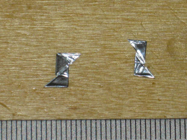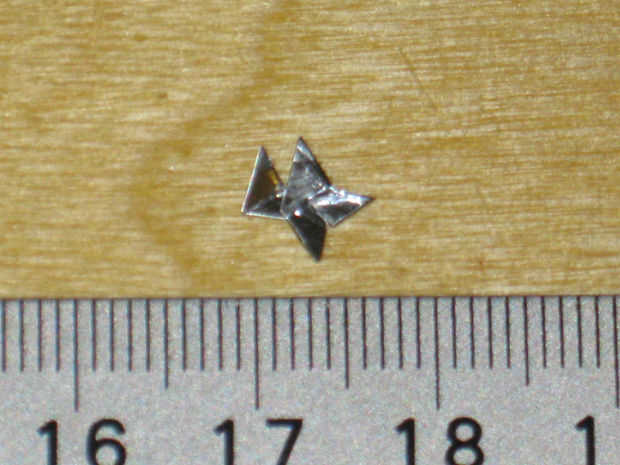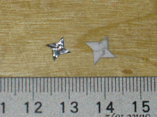 A pesar de que el aluminio y el papel de estrellas donde hecho de una tira de material ancho 3mm la estrella aluminio terminó ligeramente más pequeño entonces la estrella de papel. Pero sólo por 2mm de punta a punta. Si usted puede conseguir un buen agarre y un lanzamiento decente sin las puntas colgando en su huella digital casi vuela como un papel de tamaño completo Origami estrella de lanzamiento. Yo puedo tirarlo cerca de 6 a 8 pies pero la liberación no es tan buena como quisiera ya que las puntas se atascan en mis dedos demasiado fácilmente.