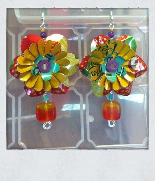 Este es mi bolso de mano casera hecha de hojas de aluminio (latas de cerveza), una camiseta vieja, bambú, perlas, alambre, lengüetas de tiro e hilo de ganchillo. Es ideal para esconder tus cosas de ganchillo u otras cosas.Me encanta reciclar y re-pro