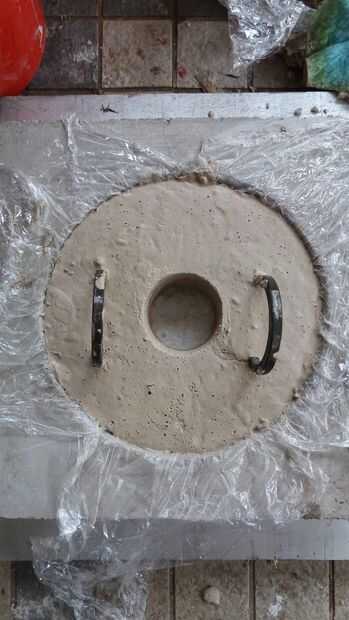 Creación de la tapa: El tamaño de la tapa debe ser del mismo diámetro que el horno y 2" de espesor. Calcular el volumen de la tapa y mezclar un lote fresco utilizando la misma relación como la anterior. Preparar un par de asas de metal y coloque en un molde circular. Utilizando una sopa puede (o algo ligeramente más grande que un aluminio puede) colocar en el centro y vierta la mezcla semi-sumergir las manijas y el poder. Antes de la mezcla correctamente establece eliminar el centro puede deja un orificio de acceso.