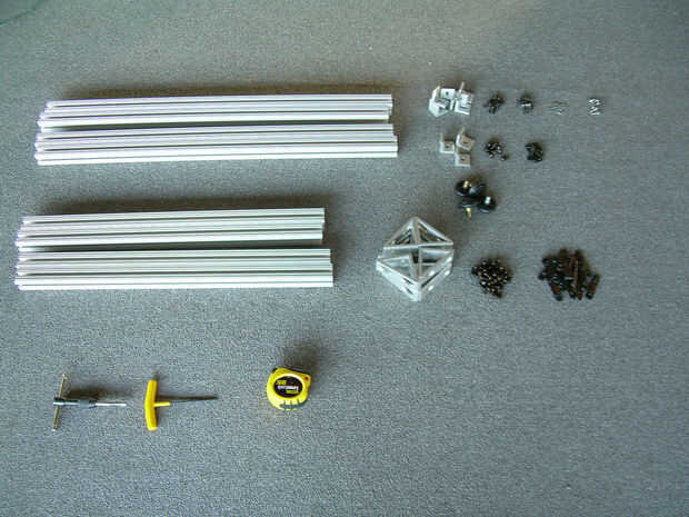 El marco de la tabla se construye usando un sistema de sección de aluminio patentado llamado 80/20. Puede utilizar aluminio extruido 80/20 para hacer casi cualquier cosa. www.80/20.net tiene un buen sitio que vende las cosas y todos los accesorios - pero sus para la venta de una amplia variedad de minoristas en línea. Básicamente su comercialización como un «erector set para adultos". Tiene una arboleda con forma de T que permite conectar una gran variedad de tornillos, escuadras, cosas hardware y diversión - se puede poner juntos sin embargo te gusta. Cualquier sistema similar podría ser usado - echa un vistazo a lo que puedes encontrar.