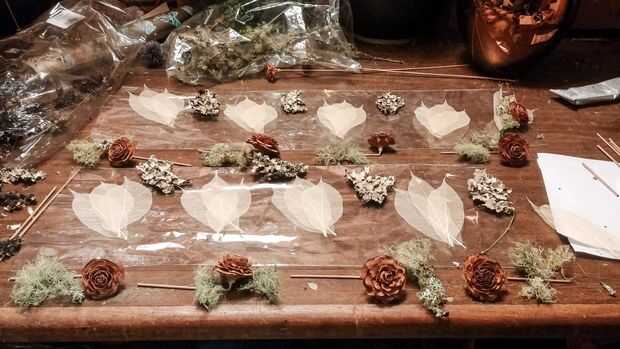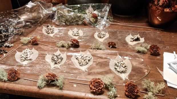 Antes de comenzar este paso desea presentar todos sus materiales y dividirlos entre los Azahares. Una vez que tiene pegamento en las manos es difícil de manejar sus materiales delicados así que establecen realmente ayuda. Ser generoso con el pegamento como aplicarlo a la parte posterior de la moss y entonces establecidas en las hojas. Usted puede aplicar algunos de los musgos más fibrosos en la parte posterior de la rosa en lugar de las hojas de cedro.
