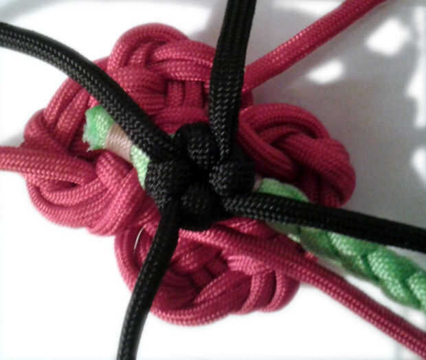 Después de esto, poner en orden los extremos de las longitudes de paracord rojo y negro. Como scout ha logrado convertir esto en un woggle utilizando los restantes hilos negro como núcleos para corta barras de Salomón (AKA Cobra Stitch, ABOK #2496) que son luego reunidos en (o podría poner una hebilla de broche de presión en. Sin embargo, un bucle simple en uno o dos de los hilos negro permitirá fácil usar como un ojal o con una correa.