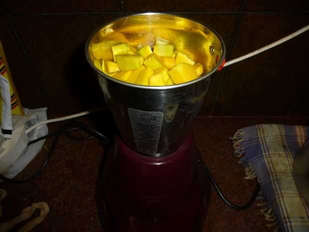 Utilizando una picadora mezcladora, rallar los cubos de calabaza y manténgalo a un lado