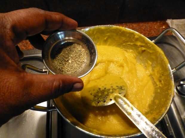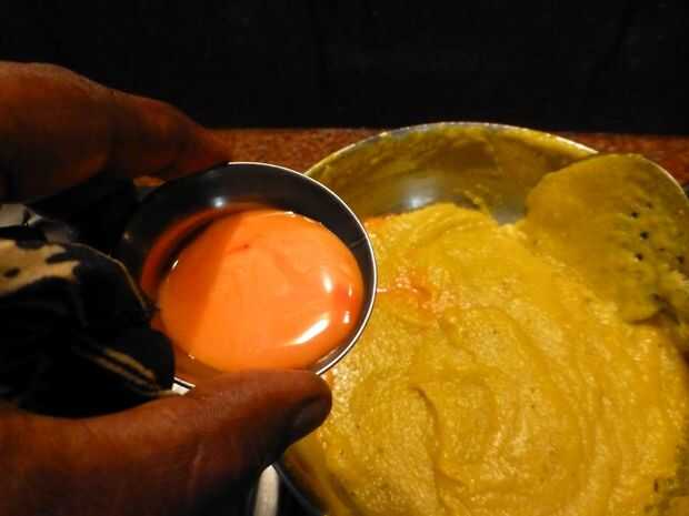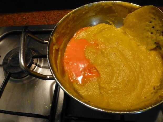 Continuar la cocción hasta que el halwa reduce en una mezcla de profundo color ámbar y brillante. Después de un tiempo, la mezcla no se pegue y sale limpio de la bandeja.
