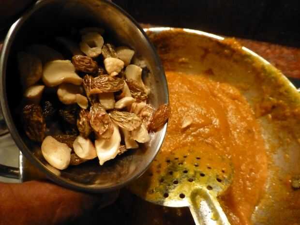 Ahora agregue el polvo de cardamomo. Añadir el color de los alimentos, mezclado en una pequeña cantidad de leche, a la cacerola y revuelva bien. Añadir los anacardos fritos y pasas de uva, mezclar bien y reducir la llama.