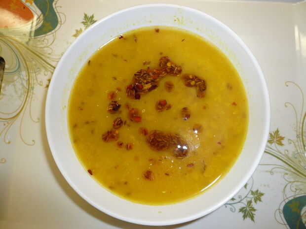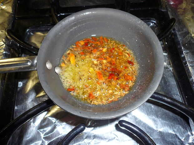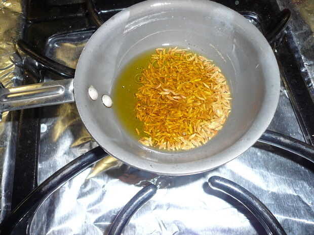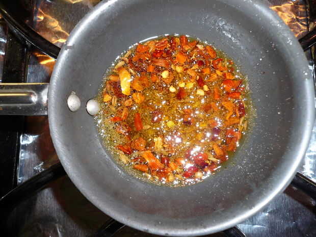 Una vez que el aceite se calienta (no fumar) Añadir semillas de comino, pimiento rojo triturado y asafétida.
