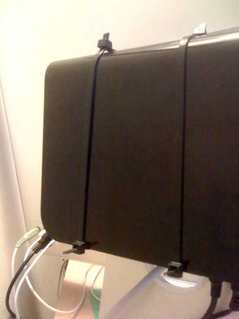 El primer paso implica el uso de dos (o más) lazos de cremallera para formar un arnés del que será suspendido el disco duro. Sólo tenía 8" zip-lazos de mentira alrededor de la casa, así que usé un total de cuatro para hacer el mazo de cables. Asegúrese de que esté apretado pero todavía lo suficientemente suelta para amarra otro por debajo del hilo de rosca.