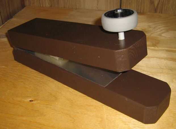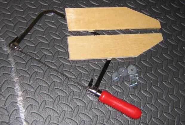 Para los laterales usé mi sierra de marquetería para cortar la madera contrachapada de 1/4 de pulgada a 2 1/2 x 9 pulgadas (6,3 cm x 22,8 cm), 6 pulgadas largo (15,2 cm) superior con un final de 3/4 de pulgada (1,9 cm).