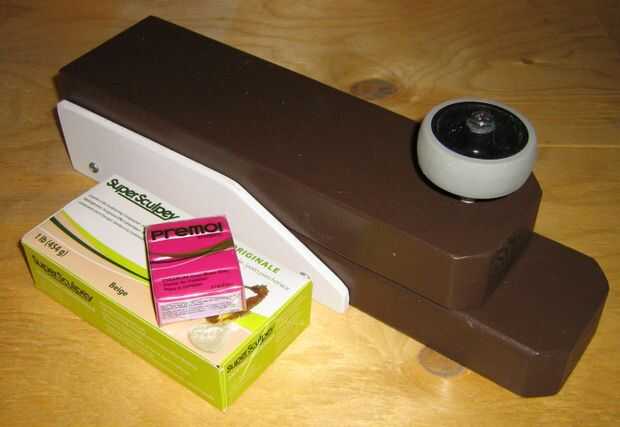 La amasadora de arcilla polímero acabado con una caja de Super Sculpey y un bloque de Premo para referencia del tamaño.