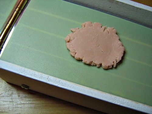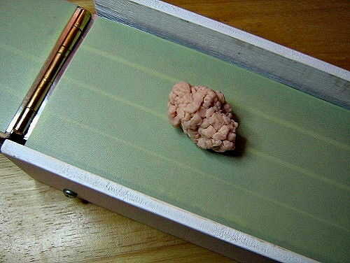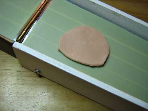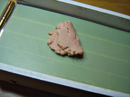 Tercera imagen: Doble de la arcilla y triturar otra vez. Lo tengo al revés en la amasadora, el doblez debe ir al lado de la bisagra por lo que las burbujas de aire serán empujadas hacia fuera.