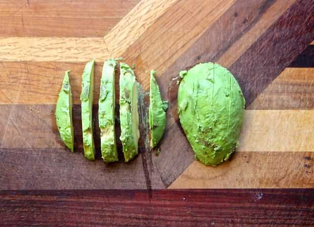 Coloque la fruta aguacate boca abajo en la tabla de cortar. Con un cuchillo de cocina, cortar el aguacate longitudinalmente en tiras ancho de 3/4 pulgadas (1,905 cm).