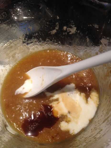 Precalentar el horno a 400 grados. Para ambas recetas, primero agregar el sustituto de huevo/huevo a la taza con mantequilla derretida y mezclar bien. Luego puede añade ambos sus azúcares y mezcla otra vez. Por último, añades la cucharada de harina, sustituto de leche leche y extracto de vainilla y remover. El último paso es agregar la nuez y revolver. Cuando todo está mezclado, puede verter la mezcla en tus moldes de pastel y hornea a 400 por 10 minutos. Después de 10 minutos, bajar el fuego a 350 y hornee por 30-40 minutos adicionales.