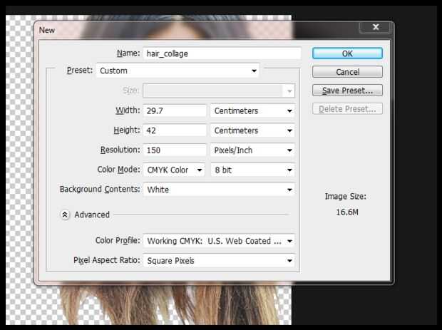 Hacer la imagen transparente de hair_collage, se llamará Layer1 colocarlo a la mesa de trabajo presionando CTRL + T (de transformación) y SHIFT + move (mover sólo de digonals, pulsar la tecla SHIFT para que la forma de la imagen siguen siendo la misma)
