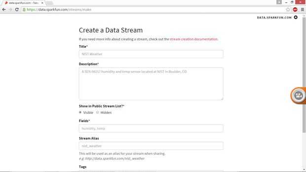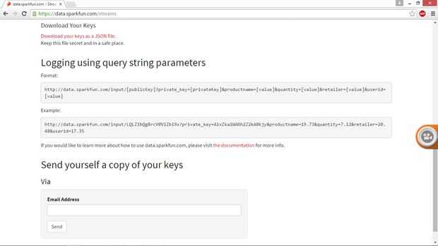 Crear unas flujo de datos gratis: https://data.sparkfun.com/streams/make. Introduzca todos los detalles en esta página y asegúrese de que crear cuatro cantidades en la sección de campos de productname, vendedor, cantidad, ID de usuario. Introduzca todos los detalles. Después de guardar todos los detalles que usted recibirá una clave pública, clave privada, eliminar clave y una URL de ejemplo que pega en el navegador entre los datos a la base de datos.
