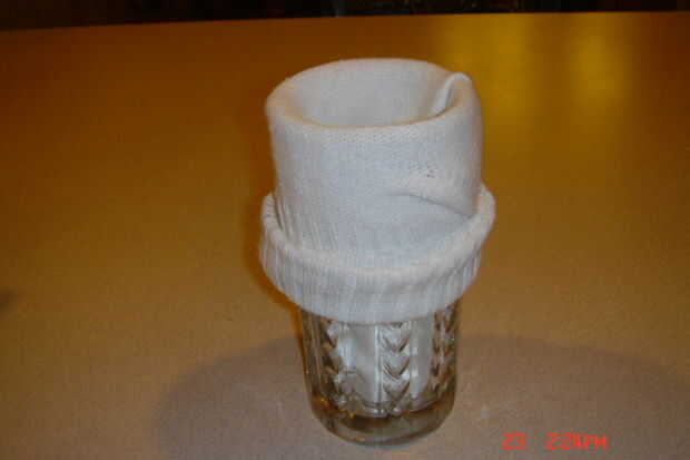 En primer lugar, poner el calcetín en el cristal y rodar el exceso en el exterior; la misma forma que pones una nueva bolsa de basura en una papelera.