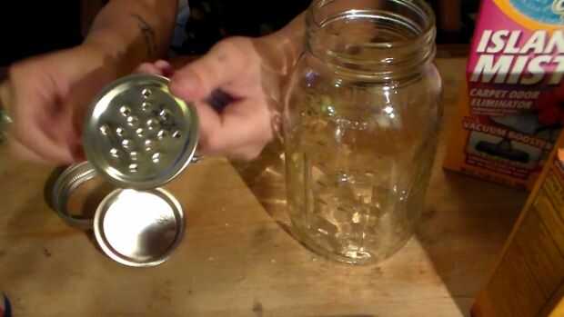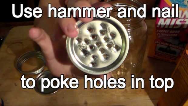 Hacer agujeros en una tapa con un martillo y un clavo para una tapa de la coctelera. Si usas un tarro de masón puede simplemente agregar otra enlomador tapa en la parte superior y sellarlo con el anillo y el frasco no se escapará. Este es un gran sistema para guardarlo.