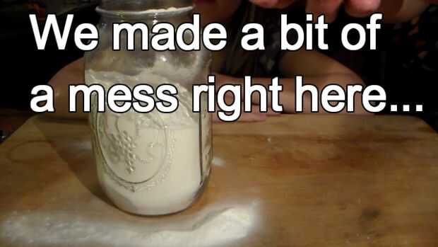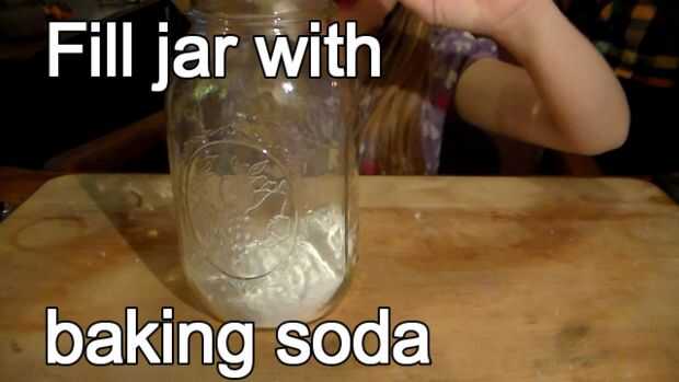 Llene el tarro con bicarbonato de sodio. Puede utilizar un embudo ancho o puede hacer un desastre como lo hicimos aquí... :)