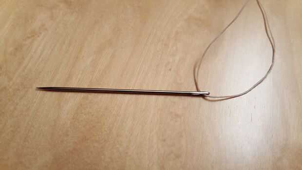 Utilice una aguja de tapicería para conectar los botones a su cabecera por los agujeros que ha perforado anteriormente. Estoy usando un hilo encerado y es enhebrar la aguja mucho más fácil (gracias tela tienda la señora!). Tire el botón tan estrecha como para darle su deseado mira y usa la pistola de grapas en el hilo para sostenerlo en lugar. Usé un par de grapas para sujetar el hilo para no tener que preocuparse de atarla. Usted notará que he utilizado un rotulador para localizar todos los agujeros que ha perforado. Me enfermé de intentar localizar todos los agujeros en las superficies de contraste de la madera que utiliza.