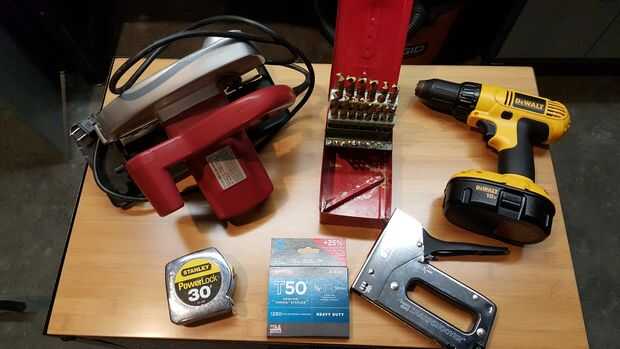 Herramientas: Taladro, pedacitos de taladro, pedacitos de destornillador, engrapadora y grapas de tapicería de la aguja, Sierra Circular (una tronzadora o ingletadora Sierra es para cortar los soportes de 2 x 4 ó 1 x 4 pero no es necesario).