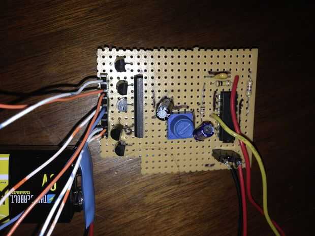 La entrada al AN6884 es un micrófono de electret. El micrófono está sesgado y filtrado de paso alto. Pero es demasiado débil para conducir el AN6884, así que primero ejecutarlo a través de uno de los op-amps en el chip de cuádruple amplificador operacional LM324. Recuerde que el nivel de amplificación de un amplificador inversor como en este circuito se determina por el cociente de la resistencia de retroalimentación a la resistencia de entrada. La resistencia de entrada es 10kΩ. Experimenté un poco aquí. Inicialmente intentó una resistencia de retroalimentación de la 47kΩ, pero fue satisfecho con la sensibilidad del circuito. Finalmente colocó en una resistencia de 330kΩ. El amplificador oscila un poco, pero no me importa. Por último señalar que la sensibilidad está también controlada por el potenciómetro de 10kΩ conectado a la entrada de AN6884. Esto le da cierto control sobre la marcha de sensibilidad en caso de cambio de nivel de ruido ambiente. Si no te gusta cómo las luces de flash en un nivel de volumen constante, se pueden colocar algunos condensadores a través de la retroalimentación y resistencias de entrada. Usted querrá asegurarse de que están correctamente equilibrados, aunque.
