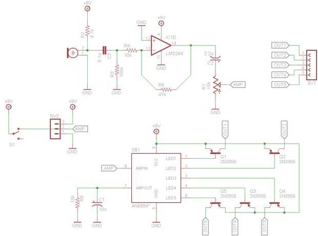 La otra característica clave aquí es el interruptor. Pasa por alto el micrófono y 9V se alimenta directamente a la entrada de AN6884 convirtiéndose en. Es una característica buena para cuando solo quieres que las luces, después de que desaparece la novedad VU.