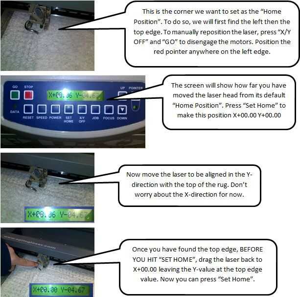 Vamos a alinear el láser en la esquina superior izquierda. En lugar de ojo-Ball lo, primero alineamos el láser sobre el borde izquierdo lo reseteo a cero. A continuación, vamos a alinear en el borde superior sin lo reseteo a cero. Por último, arrastrándola hacia la esquina para definir la "posición Inicio".