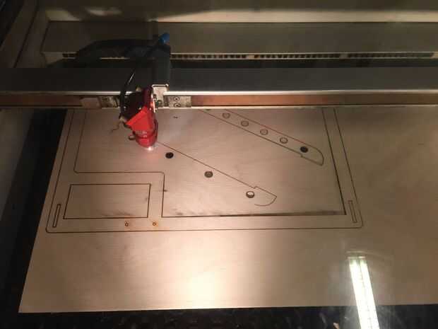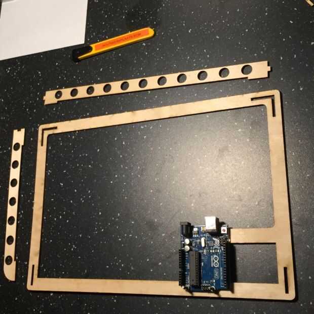 Después de que discutiéramos a las piezas que necesitamos, es el momento de comenzar a construir! Para cortar el marco utilicé un cortador láser. Puede descargar la plantilla para Adobe Illustrator que he utilizado. Con dos pernos puede conectar el Arduino al marco. Tuve que presionar duro para encajar las piezas, pero después de era sólida como una roca y no necesitas utilizar ningún pegamento. Ver las fotos para el proceso!
