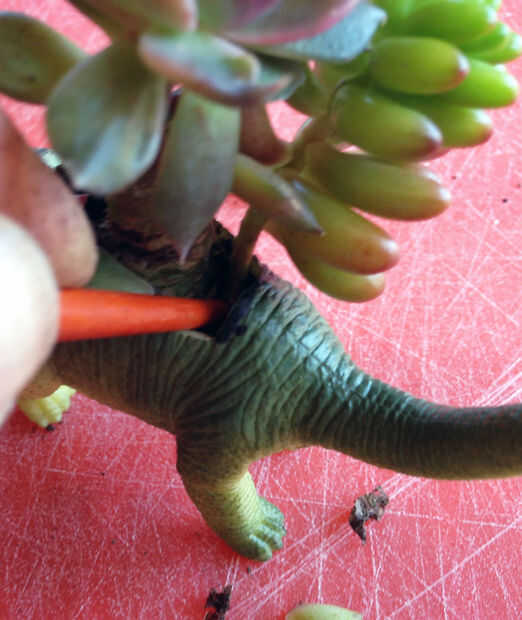 Ahora seleccione uno de los succulents pequeños que han cortado y coloque en el agujero hecho por palillos.
