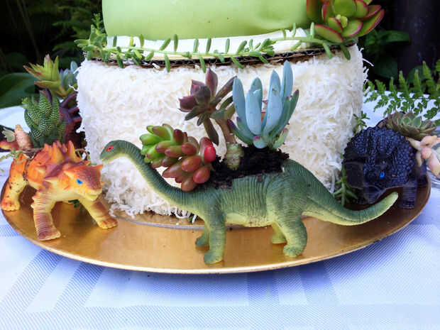 Coloque los pasteles encima de otra y agregar a los amigos de dino alrededor de la parte inferior y unas suculentas extras aquí y allá.