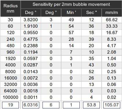 Para este espíritu particular nivel la sensibilidad es de 6° de radio de 38mm (ver foto). Esta gran sensibilidad debe ser suficiente para la mayoría de los proyectos.