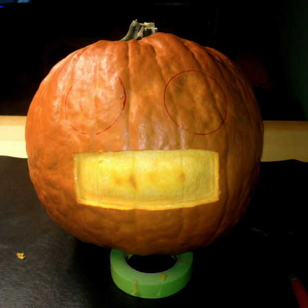 3. después de que el área que desea quitar y agregar detalles demasiado. Ayuda si agarras y cuchillo exacto o sharp y trace el borde ya retirado a la profundidad de aprox. que desea eliminar. Esto ayudará el borde salir limpio y evitar tener que hacer un montón de raspado para limpiar el interior borde. Ahora coge una herramienta más grande de la cinta y empezar a quitar la piel y la carne dentro de ese cuadro de aprox. 1/8" a 1/4" abajo en la calabaza. Que va a hacer lo mismo con los círculos y otras áreas que desea eliminar en pasos posteriores.