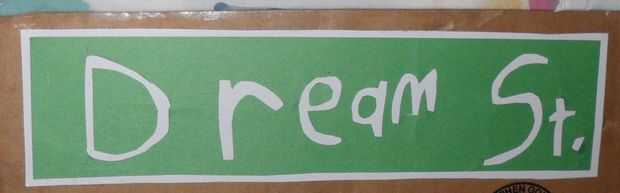 Mi sobrina también ayudó a agregar una señal de calle a su condominio. Ella impresa ella elegir el nombre de la calle en un trozo de cartulina verde con un marcador grueso. Corté las letras. Ella entonces había pegado a la señal de calle en una caja de la camisa blanca. Cuando esté seco, ella cortó la señal de calle y había pegado a la parte exterior de los condominios.